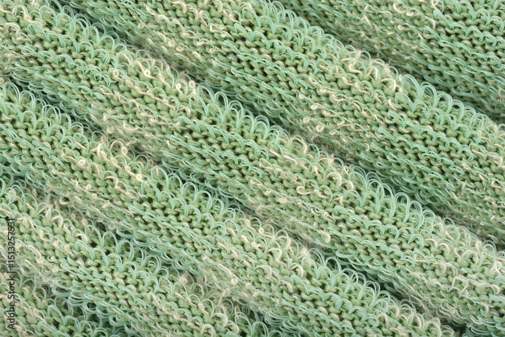 A macro detail of green knitted fabric with a unique texture and protruding plastic threads