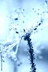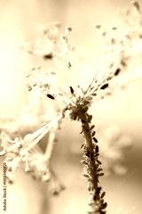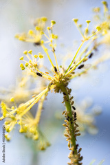 Macro photograph of aphid infestation on yellow dill flower stem. Natural scene of garden pests with soft blue sky background. High detail close-up in daylight..