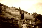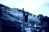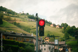 Red traffic light glowing in a quiet mountain village in Northern Italy. Afternoon sun, rolling hills, peaceful rural atmosphere..