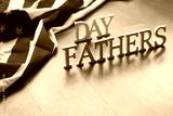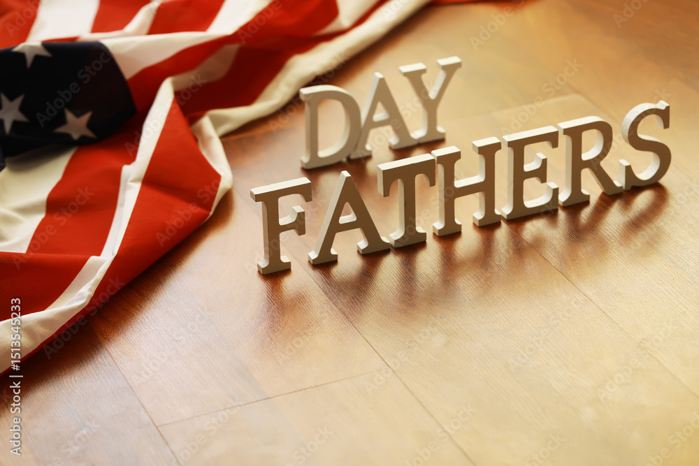 Wooden Letters Spelling 'Fathers Day' With American Flag Draped in Background on Wooden Surface