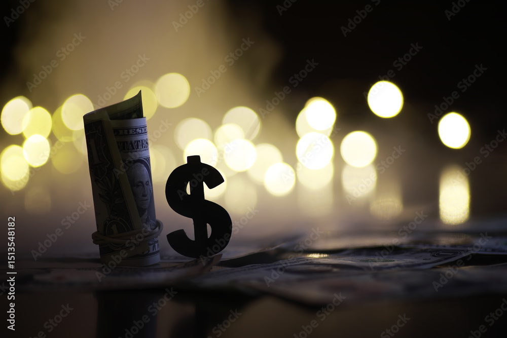 Rolled Dollar Bills and Dollar Sign Silhouette Against Blurred Bokeh Lights