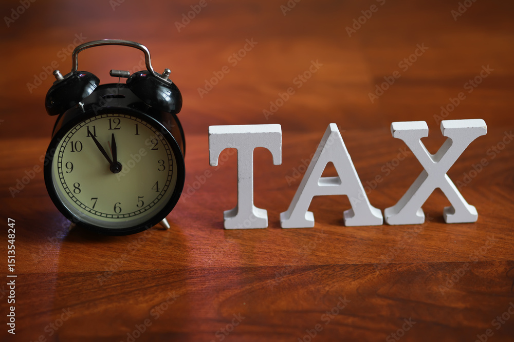 Deadline Concept with Alarm Clock and TAX Letters on Wooden Surface