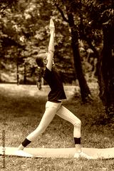 Child practices yoga in a park focusing on balance and concentration during outdoor exercise routine