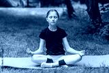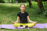 Child practicing yoga in park in day time. Girl is doing yoga in clean and green environment outdoor