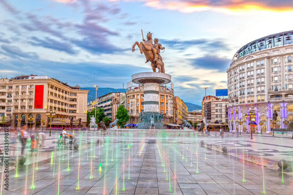 Square Macedonia in Skopje at sunset with dancing illuminated fountains and statue of Alexander the Great (Warrior on Horse) at background
