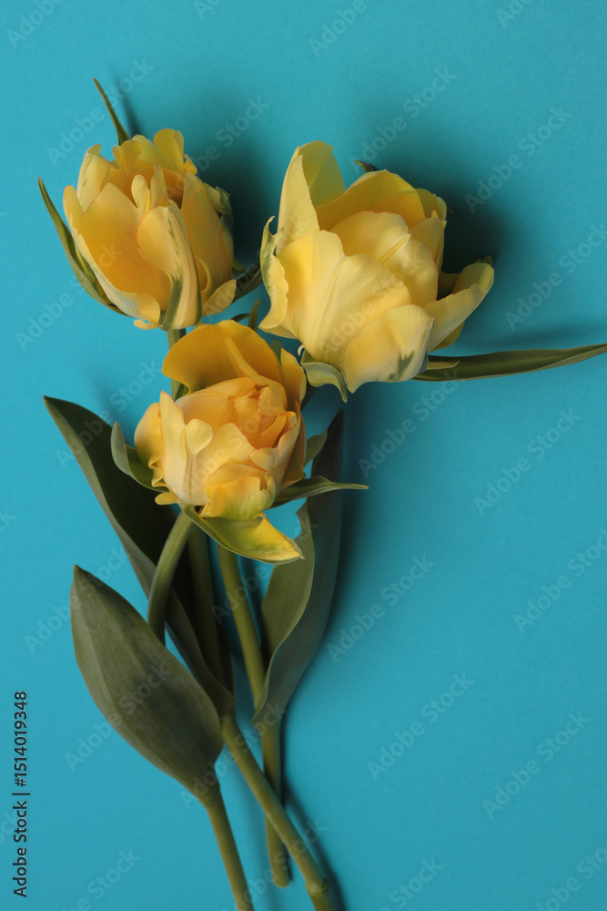 Yellow Tulip Flower Bouquet on blue. Light and shadows minimalism style template background. Flat lay, top view.