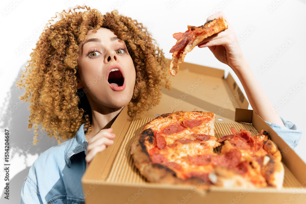 Excited woman with curly hair holding a slice of pizza from a box, expressing joy and enthusiasm for fast food, perfect for food lovers