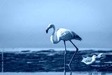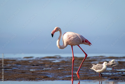Elegant pink flamingo wading through a vivid blue lagoon on a sunny day. Ideal for wildlife, birdwatching, tropical nature, and travel-related creative content.