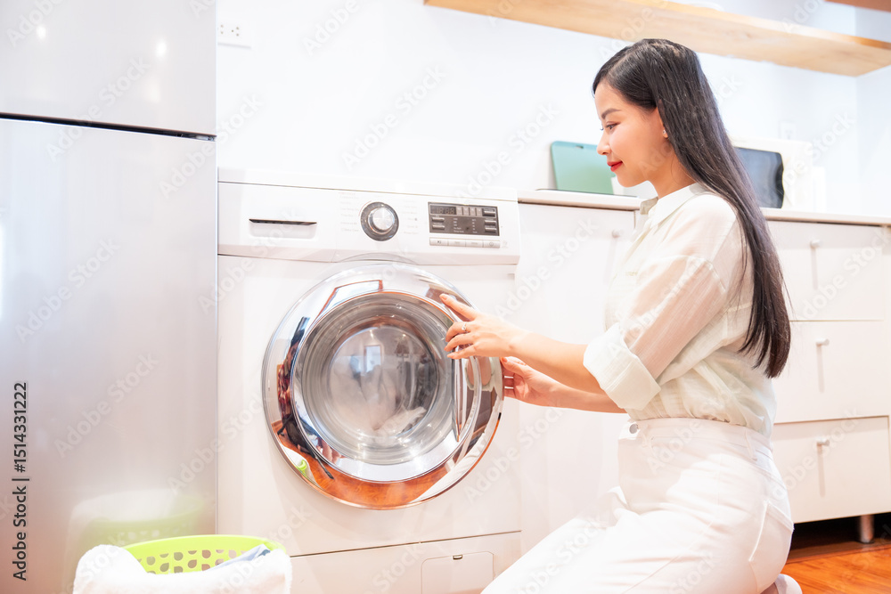 A woman in a bright minimalist kitchen loads the laundry machine with a basket of clothes nearby