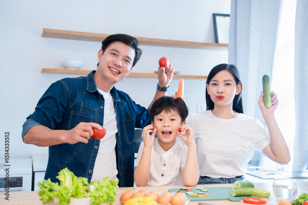 A happy family is in the kitchen and having fun while preparing vegetables for a healthy meal
