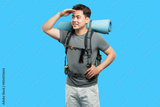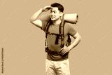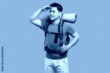 Focused backpacker gazes into the distance with hand shielding eyes ready for adventure