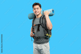 Smiling asian hiker carries a rolled mat on his shoulder He wears a backpack and light colored pants