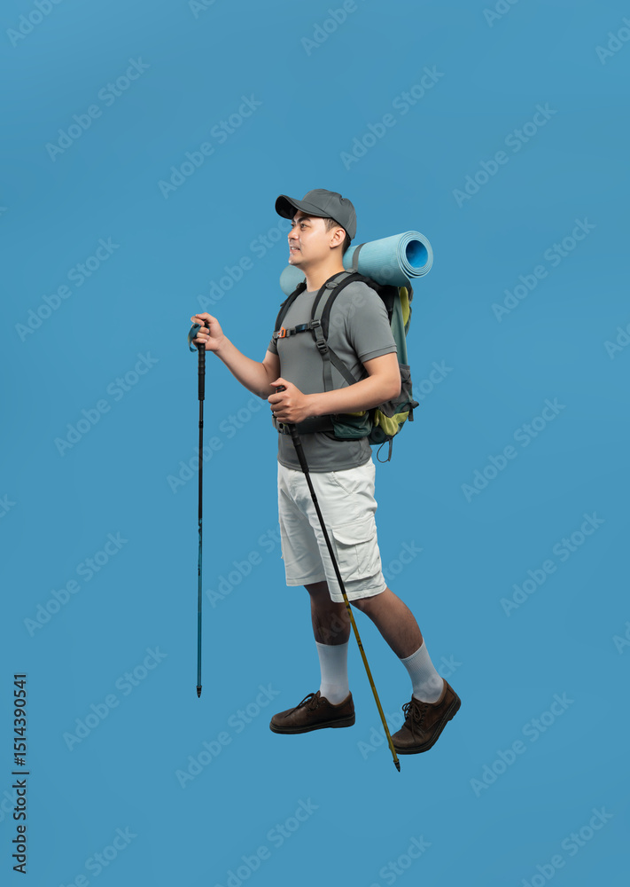 Man with backpack trekking poles and a cap ready for an outdoor adventure against a blue backdrop