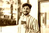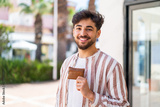 Handsome Arab man holding a wallet at outdoors smiling a lot