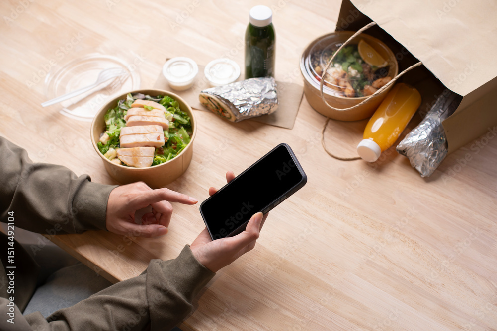 Asian woman eating healthy meal while working, Businesswoman having a lunch break at the office, hand holding phone with blank black screen for copyspace