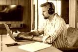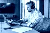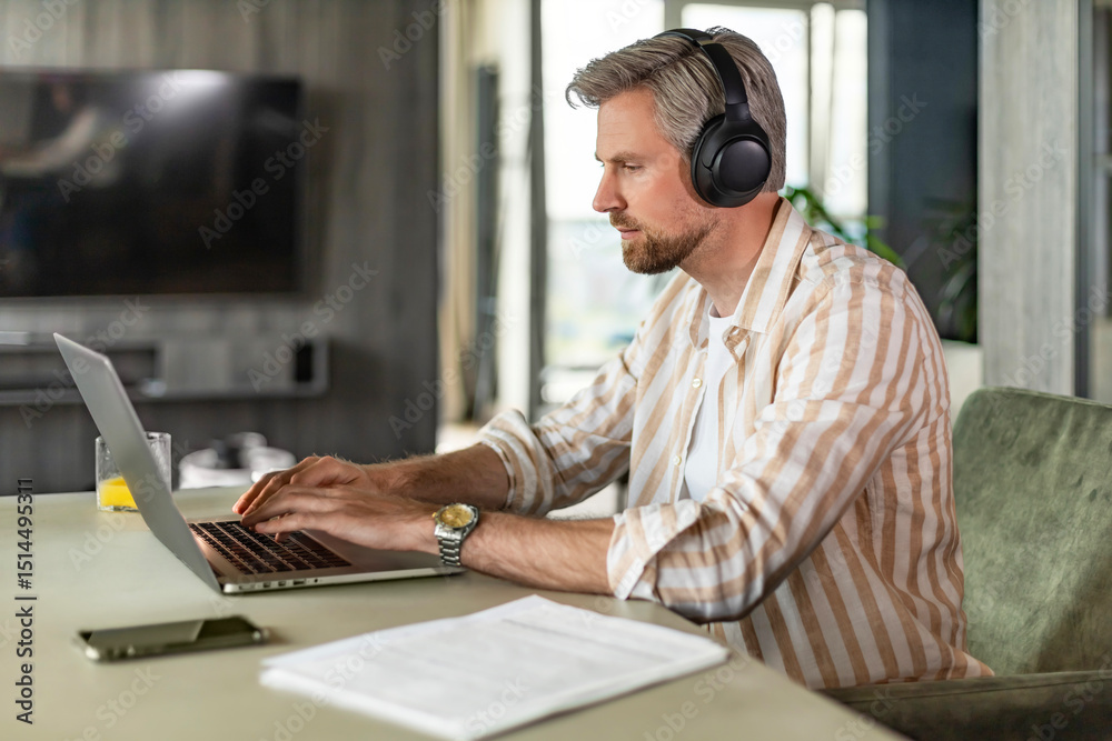 Happy young businessman is analyzing financial documents from home on laptop. Man rejoices in successfully solving a problem at work.