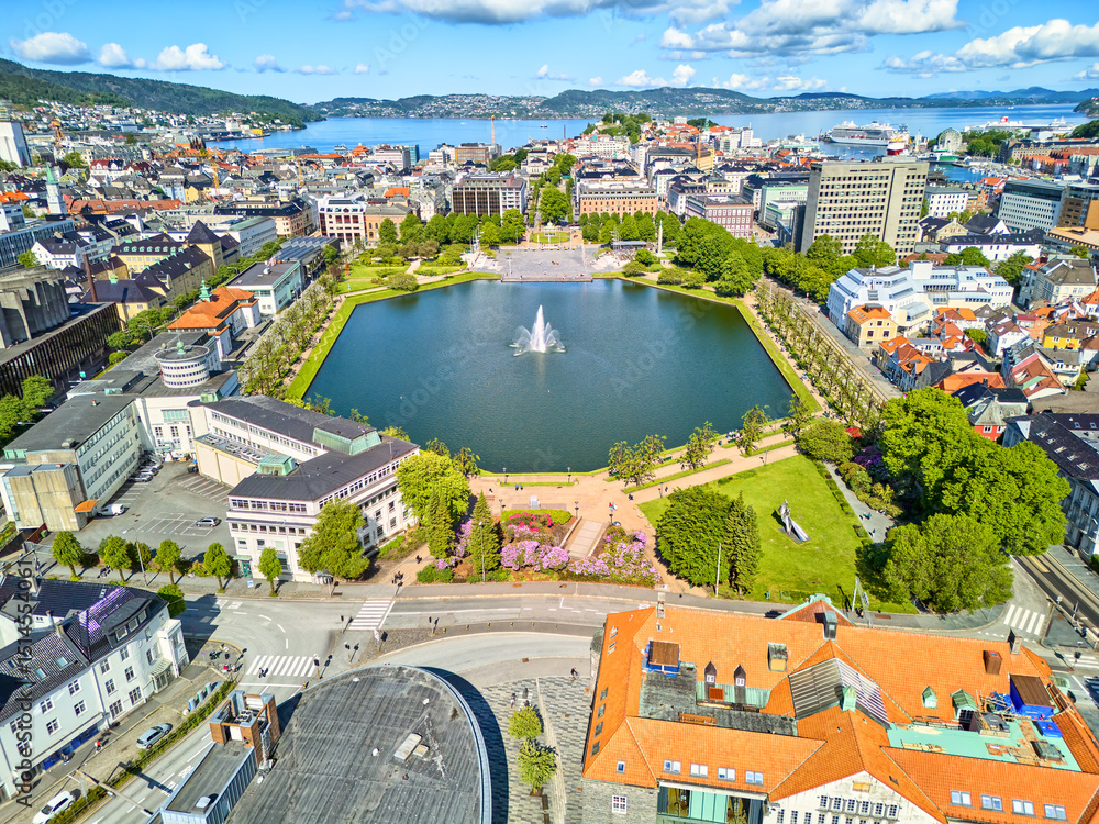 Aerial drone shot of the center of Bergen with small lake and park, Norway