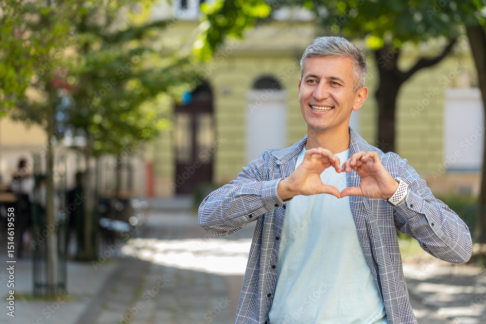 I love you. Caucasian gray-haired man makes symbol of love, showing heart sign to camera. Young adult guy express romantic, sincere positive feelings. Charity, gratitude, donation on urban city street
