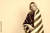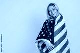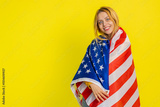 Caucasian blonde woman in blouse waving and wrapping in American USA flag, celebrating human rights and freedoms. Independence day. President election. Young adult girl isolated on yellow background