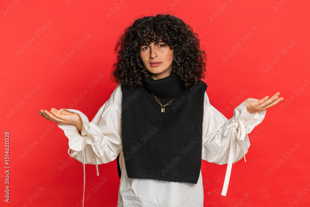 What. Why. Angry confused young woman with curly hair raising hands in indignant expression, asking reason of failure, demonstrating disbelief irritation by troubles. Girl isolated on red background