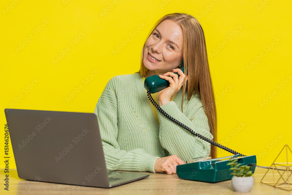 Call center or support service operator helpline. Mature woman working on laptop having wired old-fashioned retro phone from 90s telephone conversation. Young adult girl isolated on yellow background