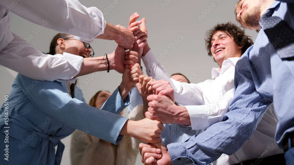 Young marketing professionals are playing a fun leadership development game. A group of people is standing in a circle