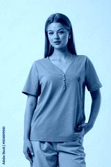 Girl model in casual clothes on a gray background posing in the studio