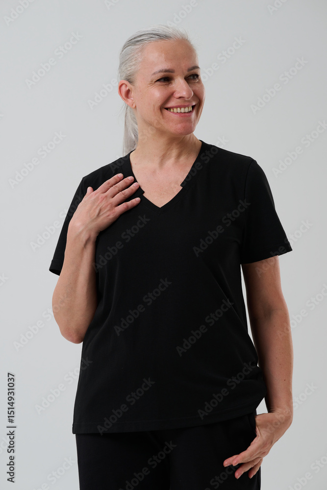 Woman in casual clothes posing in studio on grey background.