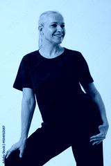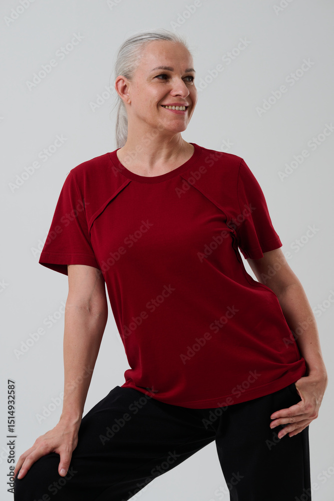 Woman in casual clothes posing in studio on grey background.