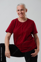 Woman in casual clothes posing in studio on grey background.
