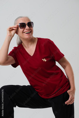 Woman in casual clothes posing in studio on grey background.