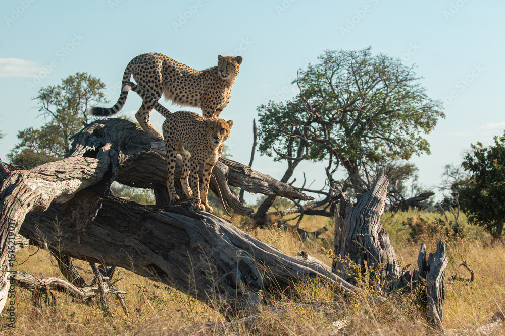 cheetah brothers at moremi national park of botswana close to third bridge camp posing on a tree