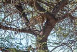 Leopard (Panthera pardus) squinting around branches of a tree at the outskirts of moremi game reserve