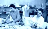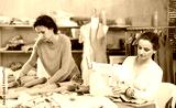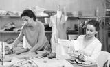 Female tailor sews on a sewing machine while another tailor cuts out patterns for a dress with scissors