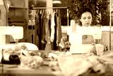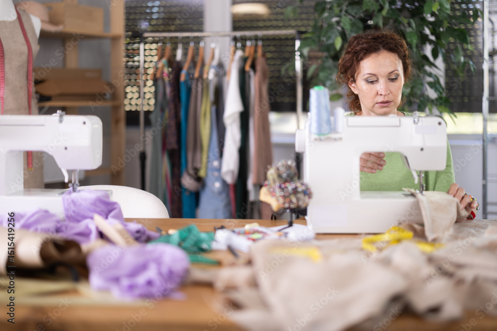 Working in sewing workshop - female dressmaker working at a sewing machine making stitches on fabric