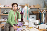 Female dressmaker talking on mobile phone - taking order for sewing clothes in sewing workshop
