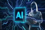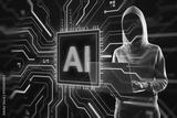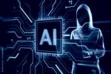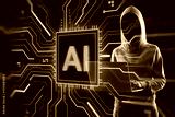 Hacker in hoodie using laptop near AI chip symbol with glowing circuit overlay on dark background, symbolizing cybercrime and digital threats.