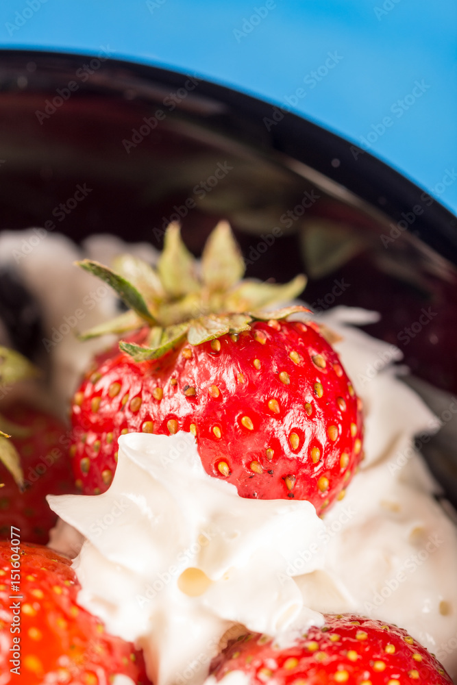 Closeup macro fresh strawberries in whipped cream