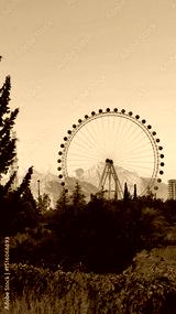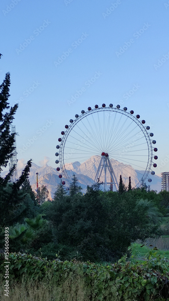 Antalya, Turkey - August 22, 2022: Ferris wheel against mountain backdrop in a scenic outdoor setting