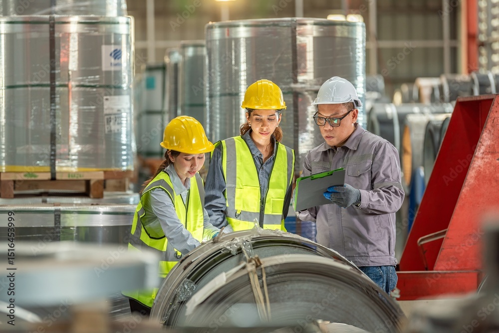 Industrial Manufactu Facility with Three Professionals in Safety Gear Analyzing Equipment and Discussing Processes in a Large Factory Setting