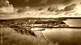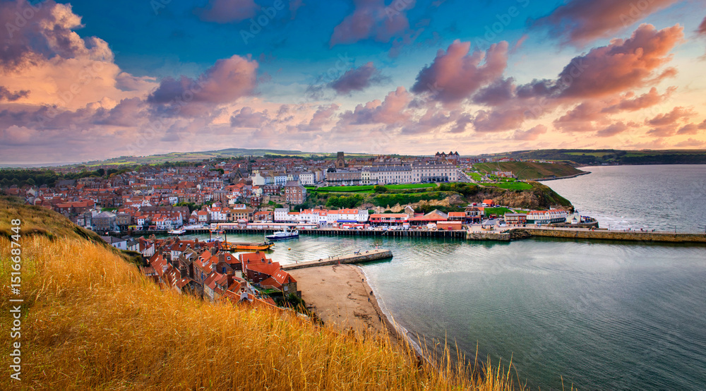 Whitby abbey is a seaside town and port at sunset in North Yorkshire, UK