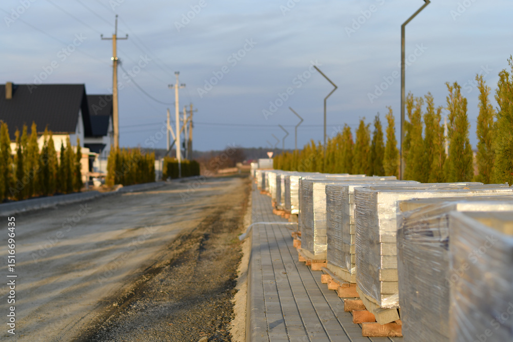 Suburban street under construction with paving materials and landscape design