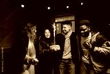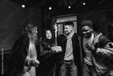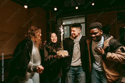 Friends celebrating together indoors with a birthday cake featuring sparklers in a cozy atmosphere during the evening