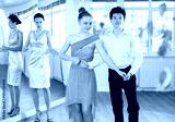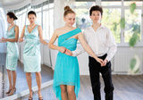 Girl and a boy in festive clothes learn to dance moresco under guidance of a teacher