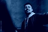 Young man enjoying social gathering while holding a drink with colorful lighting in background