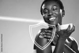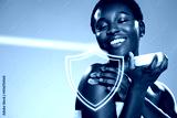 Skincare routine featuring a smiling woman applying lotion with radiant blue background