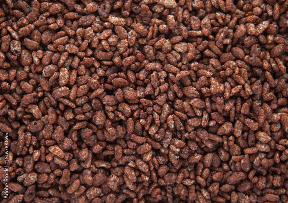Crunchy tasty chocolate rice crispues breakfast cereal textured background.Top view.