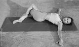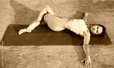 Example of performing hatha yoga asana. Amateur and professional girl doing yoga near sea, on embankment she fulfil Supta Matsyendrasana