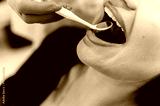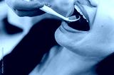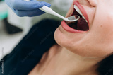 Close-up of a woman's mouth with white teeth during a dental procedure in a clinic.