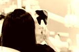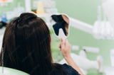 Close-up of a woman's mouth with white teeth during a dental procedure in a clinic.